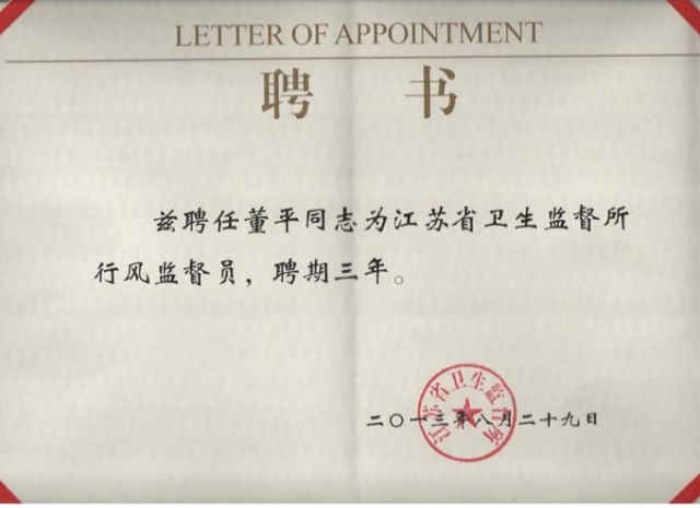 8月29日,水杯子董事長(zhǎng)董平教授被江蘇省衛(wèi)生監(jiān)督所聘請(qǐng)為行風(fēng)監(jiān)督員,聘期三年,行風(fēng)監(jiān)督員的主要任務(wù)是實(shí)事求是、客觀公正地開展衛(wèi)生督查工作,為衛(wèi)生監(jiān)督行風(fēng)建設(shè)建言獻(xiàn)策,提出寶貴意見和建議。此次江蘇省內(nèi)僅有12位企事業(yè)領(lǐng)導(dǎo)獲此殊榮。
