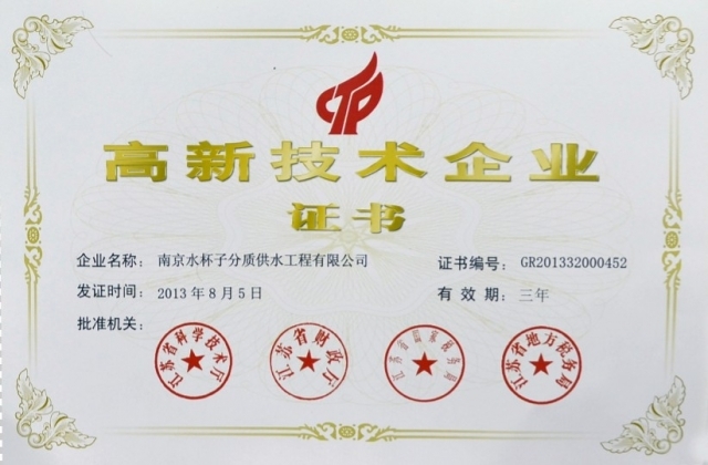 2014年1月10日,南京水杯子分質供水工程有限公司獲批成為高新技術企業,并取得證書。此次證書的取得不僅是對我公司整體技術水平的肯定和認可,同時也是對我們的一種激勵。