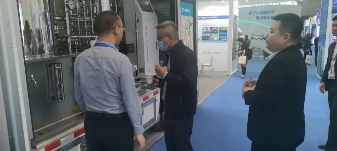 首先,整車的外觀進行了專門的設計,車身進行了一系列的美化,將應急直飲水車的應用場景、特點介紹等內容展現給大家,進一步展現其功能上的強大。參展期間,有許多來往客商都會駐足品嘗,他們紛紛都對這現場制出來的水贊不絕口,并針對直飲水行業發展進行了深入交流。